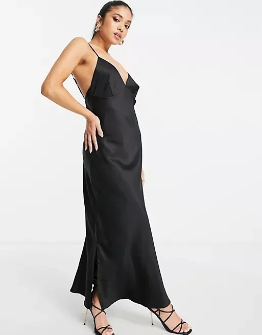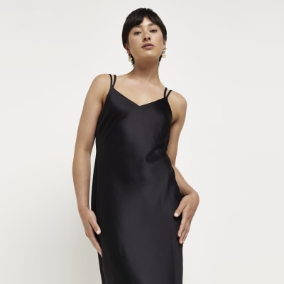 Petite Black Satin Slip Midi Dress River Island
